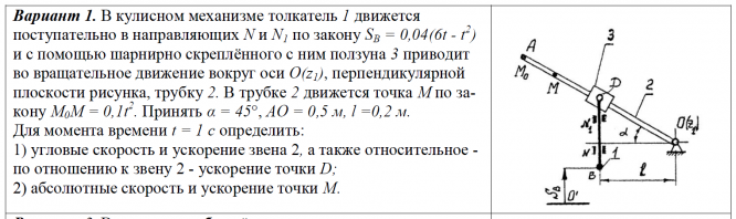 Вариант 1. В кулисном механизме толкатель 1 движется поступательно в направляющих N и N1 по закону SB = 0,04(6t - t 2 ) и с помощью шарнирно скреплённого с ним ползуна 3 приводит во вращательное движение вокруг оси O(z1), перпендикулярной плоскости рисунка, трубку 2. В трубке 2 движется точка М по закону М0М = 0,1t 2 . Принять α = 45°, АО = 0,5 м, l =0,2 м. Для момента времени t = 1 c определить: 1) угловые скорость и ускорение звена 2, а также относительное - по отношению к звену 2 - ускорение точки D; 2) абсолютные скорость и ускорение точки M. .