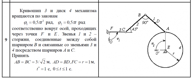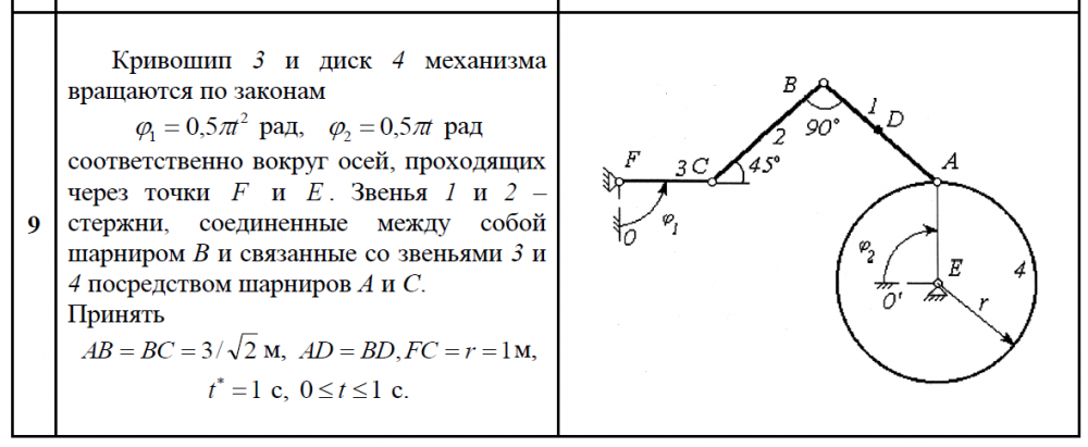Кривошип 3 и диск 4 механизма вращаются по законам 2 1 0,5t рад, 0,5t 2 рад соответственно вокруг осей, проходящих через точки F и E . Звенья 1 и 2 – стержни, соединенные между собой шарниром В и связанные со звеньями 3 и 4 посредством шарниров А и С. Принять AB BC 3/ 2 м, AD BD,FC r 1 м, 1 t с, 0 t 1 с..
