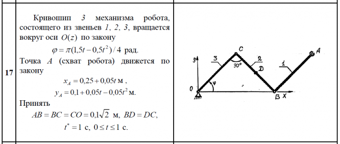 Кривошип 3 механизма робота, состоящего из звеньев 1, 2, 3, вращается вокруг оси O(z) по закону (1,5 0,5 )/ 4 2    t  t рад. Точка А (схват робота) движется по закону x t A  0,250,05 м , 2 y 0,1 0,05t 0,05t A    м. Принять AB  BC CO  0,1 2 м, BD  DC, 1  t с, 0  t 1 с. .