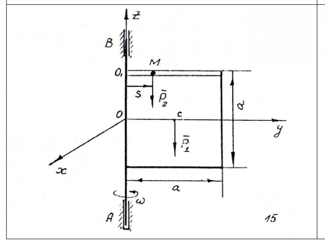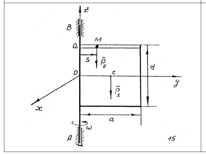 ДИНАМИЧЕСКИЕ РЕАКЦИИ ПОДШИПНИКОВ. Авторы Занозин П. В., Ефремова Л. Е., Плешаков Ю. Д. Издательство МВТУ им. Н. Э. Баумана, 1986 год. Задача 1-го типа (кроме и 8, 15, 17, 25, 28, 30) Материальная система, состоящая из однородных плоских тел и отдельных грузов, которые рассматриваются как материальные точки, равномерно вращается с угловой скоростью ω вместе с крестовиной. Крестовина закреплена в подпятнике A и подшипнике B, причём ось её вращения принята за ось OZ системы координат OXYZ, вращающейся вместе с крестовиной. Тела системы связаны с помощью шарнира и пружин, жесткость которых c. Требуется найти указанные ниже параметры. Вариант \"а\". Определить: 1.