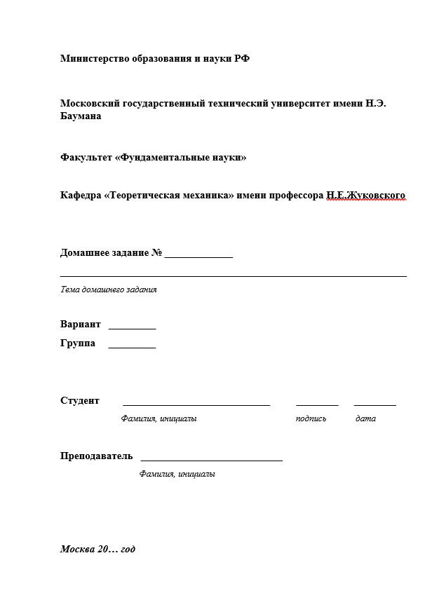 Для студентов МГТУ им. Н.Э.Баумана по предмету Теоретическая механикаТитульный лист для домашнего заданияТитульный лист для домашнего задания