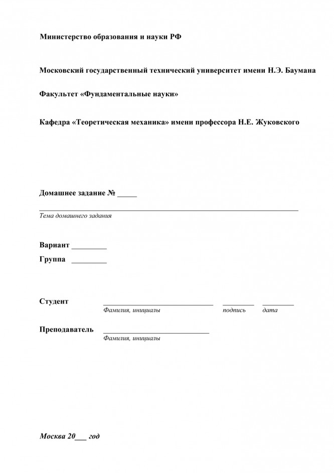 Титульный лист для сдачи домашних заданий (типовых расчетов) по теоретической механике.