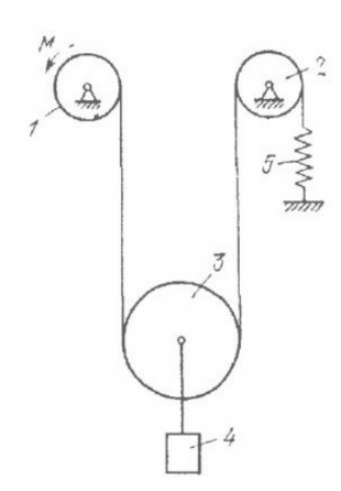 Аналитическая механика: блок 3 веса Р = 40 Н подвешен на нити, которая намотана на блок 1 и перекинута через блок 2. Свободный конец нити прикреплен к пружине 5, коэффициент жесткости которой с = 3000 H/м. К центру блока 3 подвешен груз 4 весом Q = 20 Н. К блоку 1 приложена пара сил с моментом М, радиус этого блока r = 0.1 м.