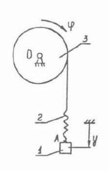 Аналитическая механика: Элементарная работа на возможных перемещениях механической системы для сил упругости пружины 2 жесткости с и недеформированной при ф=0 и у=0. Нить по блоку не скользит. Радиус блока - R.