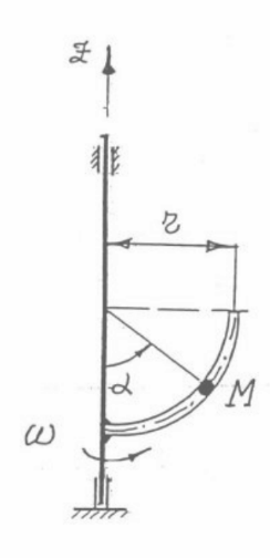 Динамика точки: Точка М массой m = 4 кг движется в трубке, изогнутой по дуге окружности радиуса r = 1 м, вращающейся вокруг вертикальной оси с угловой скоростью ω = 2t+2 рад/с. Угол α изменяется по закону α = пt/3 рад. Определить величину центробежной силы инерции, действующей на точку, в момент времени t = 0.5 с
