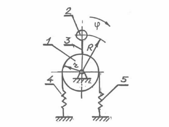 С однородным диском 1 массой m1 = 8 кг невесомым стержнем связан груз 2 массой m2 = 2 кг , R = 2r = 1 м, коэффициенты жёсткости пружин С4 = C5 = Спр, Спр = 2Скр, где Скр - значение коэффициента жесткости пружины, при котором равновесие системы, соответствующее вертикальному положению кривошипа, становится неустойчивым. Приняв за обобщенную координату угол поворота диска 1, отсчитываемый от положения равновесия, в котором стержень 3 расположен вертикально, определить: