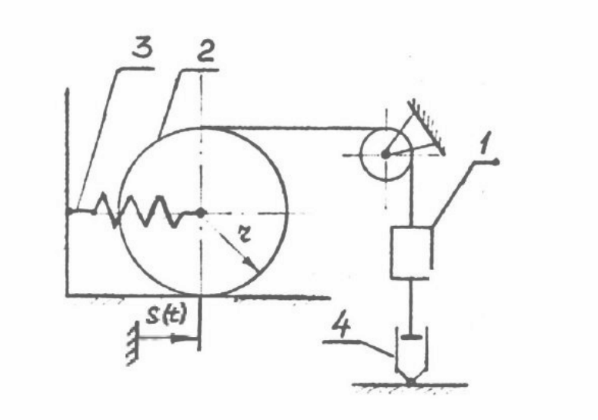 Масса барабана 2: М=8 кг, барабан считать однородным цилиндром. Масса блока 1 (материальная точка), m= 1 кг Статическая деформация для пружины 3, Δcm=0.01 м