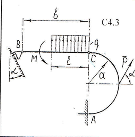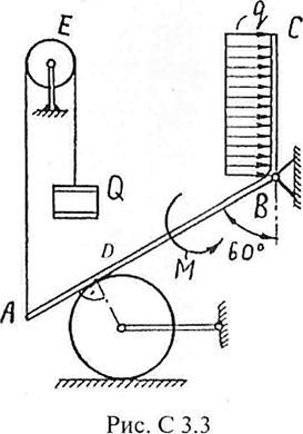 | Рычаг АБС с осью вращения в точке В, опирающийся в точке D на гладкий цилиндр, испытывает действие груза Q, распределенной нагрузки интенсивности q и пары сил с моментом М. Пренебрегая весом рычага, найти реакции опор, если АВ= 2ВС= 2а: AD = 0,5а; Q = 8кН; q = ЗкН/м; М= 5 кН м; а = 2,5 м. |