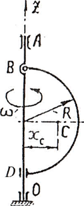 Однородная проволочная полуокружность массой т, радиусом R вращается с постоянной угловой скоростью w вокруг оси OA. Определить реакции в точках крепления В и D кольца к оси OA. Расстояние от центра тяжести полуокружности до оси OA xc =2R/3π.