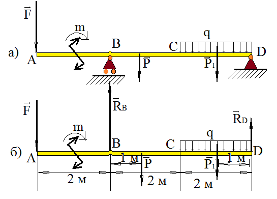 Консольная балка AD весом P=4 кН лежит на двух опорах B и D причем опора B расположена па катках. На конце A к балке приложена вертикальная сосредоточенная сила F = 8 кН. На участке CD на балке находится равномерно распределенная нагрузка интенсивности q= 0,5 кН. На участке AB к балке приложена пара сил с моментом m = 6 кН∙м.