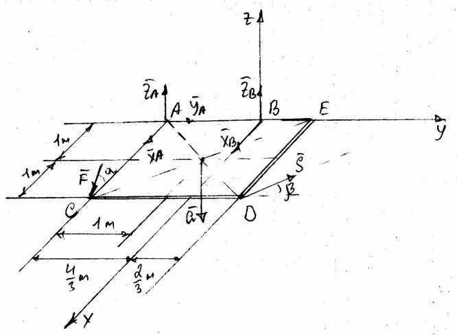 Определить реакции сферического шарнира А(Xa, Ya, Za), петли B (Xb, Zb) и невесомого стержня KD (S), удерживающих в покое горизонтально расположенную однородную плиту весом G , если в точке C на плиту действует сосредоточенная сила F.