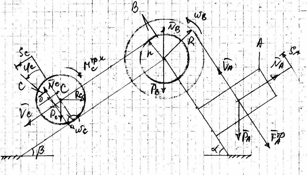 Дано: mA=6кг, mB=3кг, mC=16кг, α=60º, β=30º, RC=24см=0.24м, g≈9.81м/с2, R=48см=0.48м, r=32см=0.32м, i=41см=0.41м, f=0.03, δ=0.3мм=0.0003м, SA=1м.