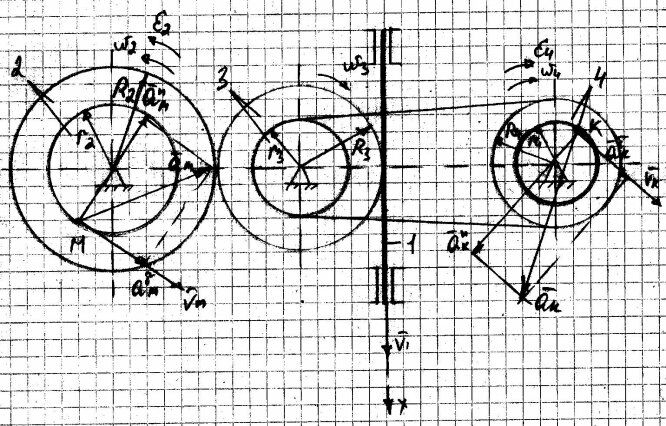Механизм состоит из ступенчатых колес 2, 3, 4, находящихся в зацеплении или связанных ременной передачей, и зубчатой рейки 1. На ободьях колес расположены точки M и K.