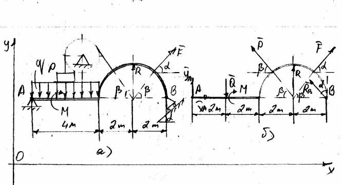 Дано: F=25kH, P=20kH, q=5kH/м, M=12kH*м, α=45º, β=60º.