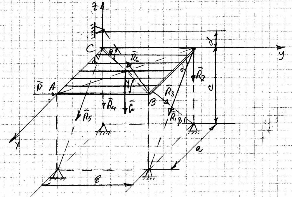 Главная » Учебные материалы » Теоретическая механика » Решения задач » Несколько классов/семестров » Прямоугольная однородная горизонтальная плита весом G опирается на шесть невесомых шарнирно закрепленных с обеих сторон стержней. Вдоль ребра плиты действует сила P. Найти реакции стержней. Дано: G=2kH, P=1kH, a=4м, b=c=2м, d=1м, M. Определить: R1,