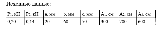 Главная » Учебные материалы » Теоретическая механика » Решения задач » НИУ «МЭИ» » Несколько классов/семестров » Невесомый стержень переменного сечения с площадями A1, A2, A3 и длинами участков a1, a2, a3, жёстко защемлённый по концам, находится под действием сил P1 и P2. Модуль упругости E=2 . 105 МПа.
