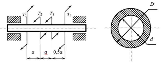 Полый стальной вал (рис. 2) нагружен парами сил с моментами T1, T2, Т3, Т4, T2=Т3. Под действием момента Т1 вал закручивается на угол φ=0,2 радиана на длине α. Требуется определить диаметр вала, если даны в таблице 2: α=d/D, T1, T2, а. Построить эпюры крутящихся моментов Тк и углов закручивания φ.