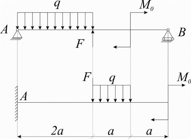 Для студентов УГАТУ по предмету Теоретическая механикаОпределить реакции опор балки (рис. 3), поперечные силы Q, изгибающие моменты M; построить эпюры Q и M, если известны нагрузки F, M0, q и d (табл. 3).Определить реакции опор балки (рис. 3), поперечные силы Q, изгибающие моменты M; построить эпюры Q и M, если известны нагрузки F, M0, q и d (табл. 3).