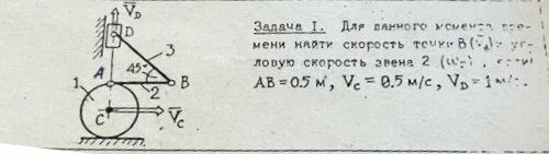 Задача 1: Для данного момента времени найти скорость точки B и условную скорость звена 2, если AB = 0.5 м, VC = 0.5 м/с, VD = 1 м/с
