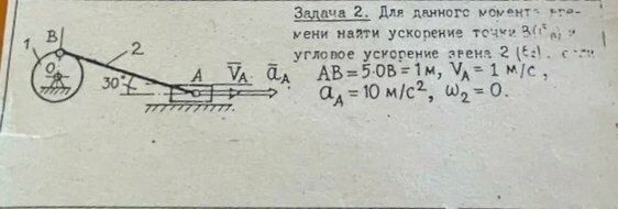 Задача 2: Для данного момента времени найти ускорение точки B и угловое ускорение звена 2, если AB = 5OB = 1 м, VA = 1 м/с, aA = 10 м/с2, w2 = 0