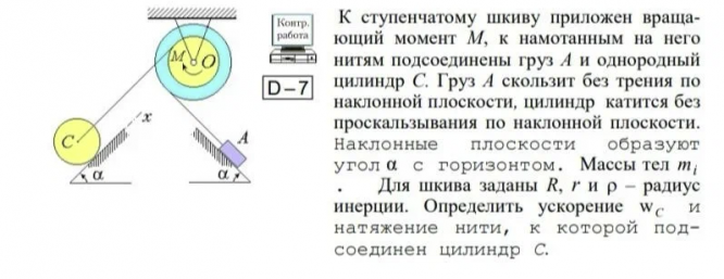 Задача: к ступенчатому шкиву приложен вращающий момент М. К намотанным на него нитям присоединены груз А и однородный диск С. Груз А скользит без трения, а цилиндр С катится без проскальзывания по наклонным плоскостям, образующим угол α к горизонту.