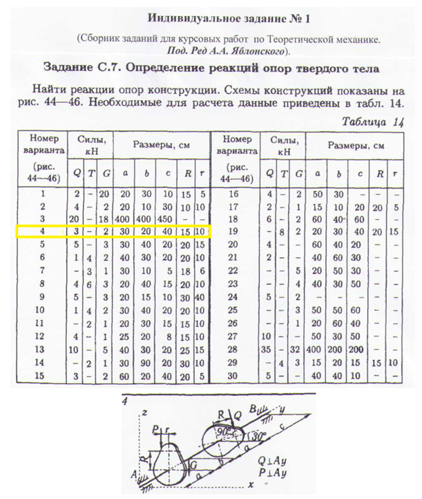 Задача С.7: Определение реакций опор ивердого тела. Пространственная конструкция вариант 4