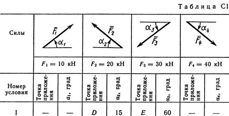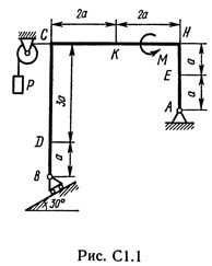 В точке С к раме привязан трос, перекинутый через блок и несущий на конце груз весом Р = 25 кН. На раму действуют пара сил с моментом М = 100 кН·м и две силы, значения, направления и точки приложения которых указаны в таблице (например, в условиях № 1 на раму действует сила F2 под углом 15° к горизонтальной оси, приложенная в точке D, и сила F3 под углом 60° к горизонтальной оси, приложенная в точке Е, и т.д.).