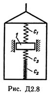 В таблице обозначено: c1, с2, c3 - коэффициенты жесткости пружин, λ0 - удлинение пружины с эквивалентной жесткостью в начальный момент времени t = 0, v0 - начальная скорость груза по отношению к лифту (направлена вертикально вверх). Прочерк в столбцах c1, с2, c3 означает, что соответствующая пружина отсутствует и на чертеже изображаться не должна. Если при этом конец одной из оставшихся пружин окажется свободным, его следует прикрепить в соответствующем месте или к грузу или к потолку (полу) лифта; то же следует сделать, если свободными окажутся соединенные планкой 2 концы обеих оставшихся пружин.