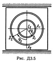 Механическая система состоит из грузов D1 массой m1 = 2 кг и D2 массой m2 = 6 кг и из прямоугольной вертикальной плиты массой m3 = 12 кг, движущейся вдоль горизонтальных направляющих (рис. Д3.0 - Д3.9, табл. Д3). В момент времени t0 = 0, когда система находилась в покое, под действием внутренних сил грузы начинают двигаться по желобам, представляющим собой окружности радиусов r = 0,4 м и R = 0,8 м.