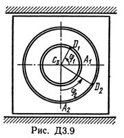Механическая система состоит из грузов D1 массой m1 = 2 кг и D2 массой m2 = 6 кг и из прямоугольной вертикальной плиты массой m3 = 12 кг, движущейся вдоль горизонтальных направляющих (рис. Д3.0 - Д3.9, табл. Д3). В момент времени t0 = 0, когда система находилась в покое, под действием внутренних сил грузы начинают двигаться по желобам, представляющим собой окружности радиусов r = 0,4 м и R = 0,8 м.