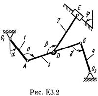 Плоский механизм состоит из стержней 1, 2, 3, 4 и ползуна В или Е (рис. КЗ.0 - К3.7) или из стержней 1, 2, 3 и ползунов В и E (рис. К3.8, К3.9), соединенных друг с другом и с неподвижными опорами O1, O2 шарнирами; точка D находится в середине стержня АВ. Длины стержней равны соответственно l1 = 0,4 м, l2 = 1,2 м, l3 = 1,4 м, l4 = 0,6 м. Положение механизма определяется углами α, β, γ, φ, θ. Значения этих углов и других заданных величин указаны в табл. КЗа (для рис. 0 - 4) или в табл. КЗб (для рис. 5 - 9); при этом в табл. КЗа ω1 и ω4 - величины постоянные.