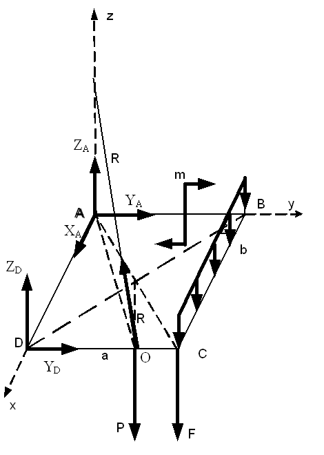 Однородная плита длиной а и шириной b имеет вес Р. Плита, закрепленная с помощью сферического шарнира, цилиндрической петли и стрежня, наклоненного к плоскости плиты под углом a, нагружена силой F, равномерно распределенной нагрузкой q и парой сил с моментом m. Определить реакции шарнира, петли и наклонного стержня.