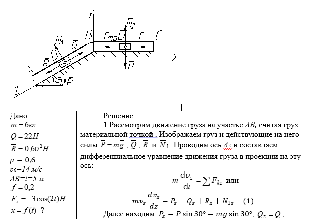 В точке В груз, не изменяя своей скорости, переходит на участок ВС трубы, где на него кроме силы тяжести действуют силы трения ( коэффициент трения груза о трубу ) и переменная сила , проекция которой на ось х .