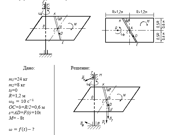 В момент времени t0=0 по желобу платформы начинает двигаться (под действием внутренних сил) груз D массой m2=8 кг по закону s=AD=F(t), где s выражено в метрах, t – в секундах. Одновременно на платформы начинает действовать пара сил с моментом M (задан в ньютонометрах; при M<0 его направление противоположно показанному на рисунке).