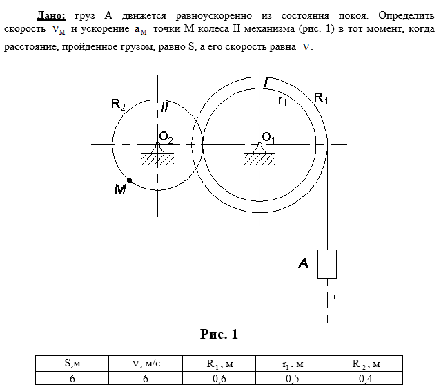Дано: груз А движется равноускоренно из состояния покоя. Определить скорость и ускорение точки М колеса II механизма (рис. 1) в тот момент, когда расстояние, пройденное грузом, равно S, а его скорость равна .
