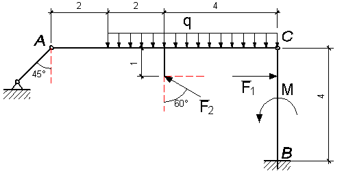 Дано: составная конструкция (схема на рис.1). F1=10 кН, F2=8 кН, М=5 кНм, q=1,2 кН/м.