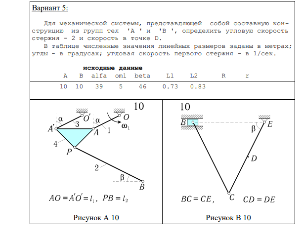 Вариант 5: Для механической системы, представляющей собой составную конструкцию из групп тел 'A ' и 'B ', определить угловую скорость стержня - 2 и скорость в точке D. B таблице численные значения линейных размеров заданы в метрах; углы - в градусах; угловая скорость первого стержня - в 1/сек. исходные данные A B alfa om1 beta L1 L2 R r 10 10 39 5 46 0.73 0.83 Рисунок А 10 Рисунок В 10