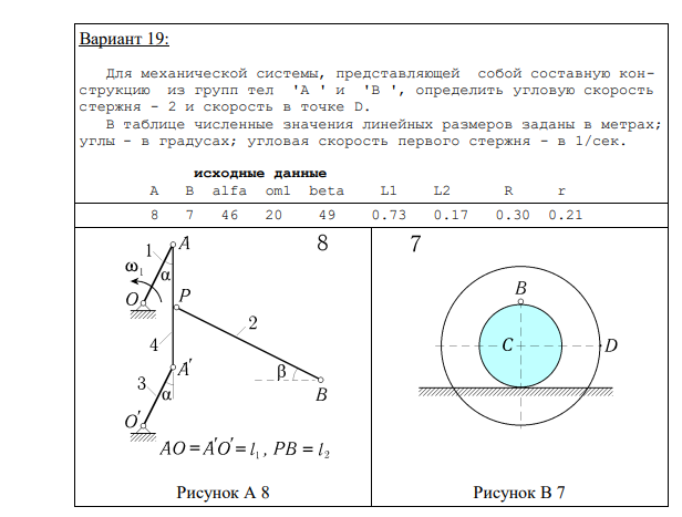 Вариант 19: Для механической системы, представляющей собой составную конструкцию из групп тел 'A ' и 'B ', определить угловую скорость стержня - 2 и скорость в точке D. B таблице численные значения линейных размеров заданы в метрах; углы - в градусах; угловая скорость первого стержня - в 1/сек. исходные данные A B alfa om1 beta L1 L2 R r 8 7 46 20 49 0.73 0.17 0.30 0.21