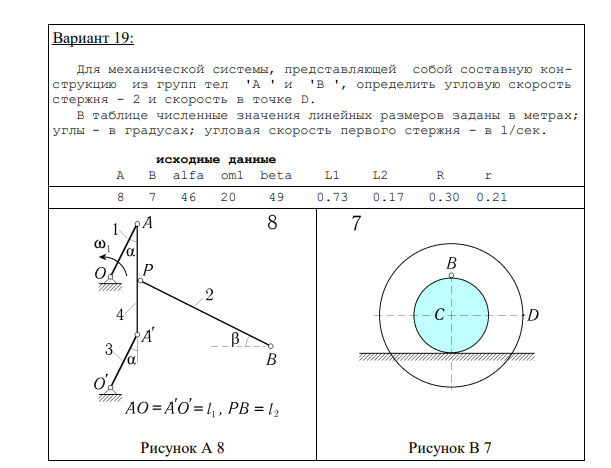 Вариант 19: Для механической системы, представляющей собой составную конструкцию из групп тел 'A ' и 'B ', определить угловую скорость стержня - 2 и скорость в точке D. B таблице численные значения линейных размеров заданы в метрах; углы - в градусах; угловая скорость первого стержня - в 1/сек. исходные данные A B alfa om1 beta L1 L2 R r 8 7 46 20 49 0.73 0.17 0.30 0.21