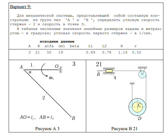 Вариант 9: Для механической системы, представляющей собой составную конструкцию из групп тел 'A ' и 'B ', определить угловую скорость стержня - 2 и скорость в точке D. B таблице численные значения линейных размеров заданы в метрах; углы - в градусах; угловая скорость первого стержня - в 1/сек. исходные данные A B alfa om1 beta L1 L2 R r