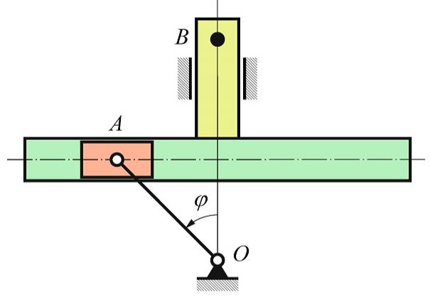 Определить модуль скорости точки В кулисы кривошипно-кулисного механизма в момент времени t = 4 с, если расстояние ОА = 8 м , а угол φ = 0,2t рад.