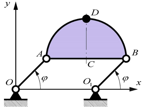 При вращении кривошипа ОА = O1В = 0,19 м спарникового механизма угол у изменяется но закону φ = πt. Определить радиус кривизны траектории точки D полукруга ABD при t = 2 с, если АВ = 0,25 м