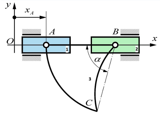 К ползунам 1 и 2 двухползунного механизма, перемещающимся вдоль оси Ох по общей направляющей, прикреплено тело 3. Точка А движется по закону хА = 0,5t 2. При t = 9 с определить скорость точки С , если расстояния АВ = ВС = 0,3 м и угол α = 75°.
