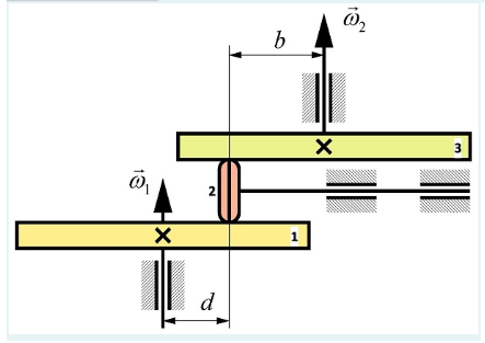 Вариатор фрикционной передачи состоит из ведущего диска 1, ролика 2 и ведомого диска 3. Угловые скорости дисков ω1 = 2,8 рад/с, ω2 = 9,9 рад/с. Определить отношение расстояний b/d.