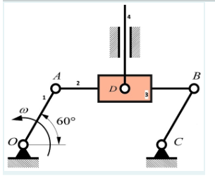 По шатуну 2 шарнирного параллелограмма OABC скользит втулка 3. К точке D втулки шарнирно прикреплен стержень 4. Для данного положения механизма определить скорость стержня 4, если скорость точки A кривошипа 1 равна 7,2 м/с.