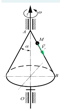 Конус вращается вокруг оси Oz с угловой скоростью ω = 4 рад/с. По его образующей с постоянной скоростью νr = 9,5 м/с движется точка М в направлении от A к B. Определить модуль абсолютной скорости этой точки в положении, когда расстояние AM = 2 м, если угол α=30°.
