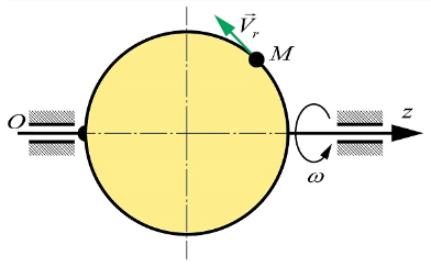 Диск вращается вокруг оси Oz. По его ободу движется точка M с постоянной относительной скоростью νr = 9,9 м/с. Определить переносную скорость точки M в момент, когда ее абсолютная скорость равна 17 м/с.
