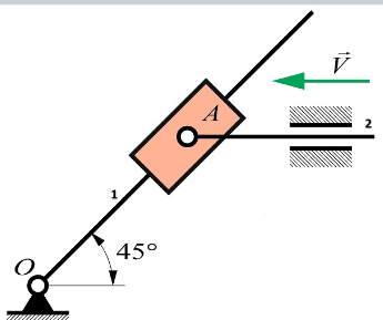 Стержень 2 кулисного механизма движется со скоростью ν = 3,7 м/с. для указанного положения механизма определить угловую скорость кулисы 1, если расстояние OA=1 м.