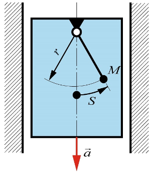 Точка М маятника движется по окружности радиуса r = 7,1 м согласно уравнению s = 5,6 sin 6t м в лифте, опускающемся с постоянным ускорением а = 0,4 м/с2. Определить модуль абсолютного ускорения точки М в момент времени, когда координата s = 0.