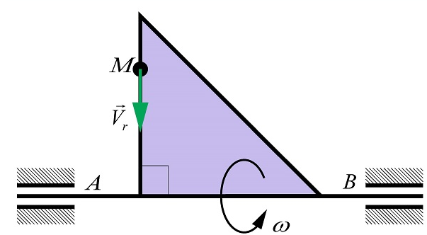 По стороне треугольника, вращающегося вокруг стороны АВ с угловой скоростью ω = 6,9 рад/с, движется точка М с относительной скоростью vr = 3,3 м/с. Определить модуль ускорения Кориолиса точки М.